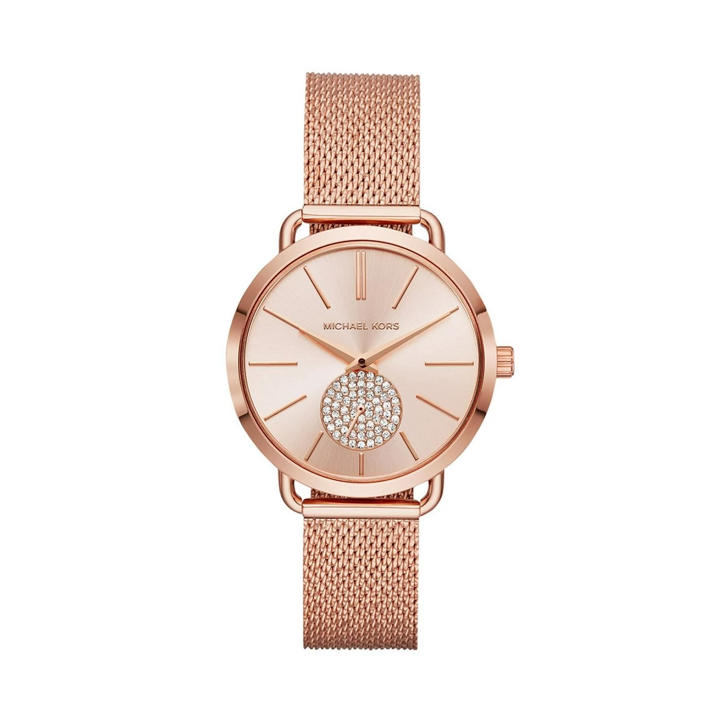 With a minimalist rose gold-tone dial featuring a pavé subdial, rounded rose gold-tone case and mesh bracelet, the ladies’ Portia watch is classically chic.